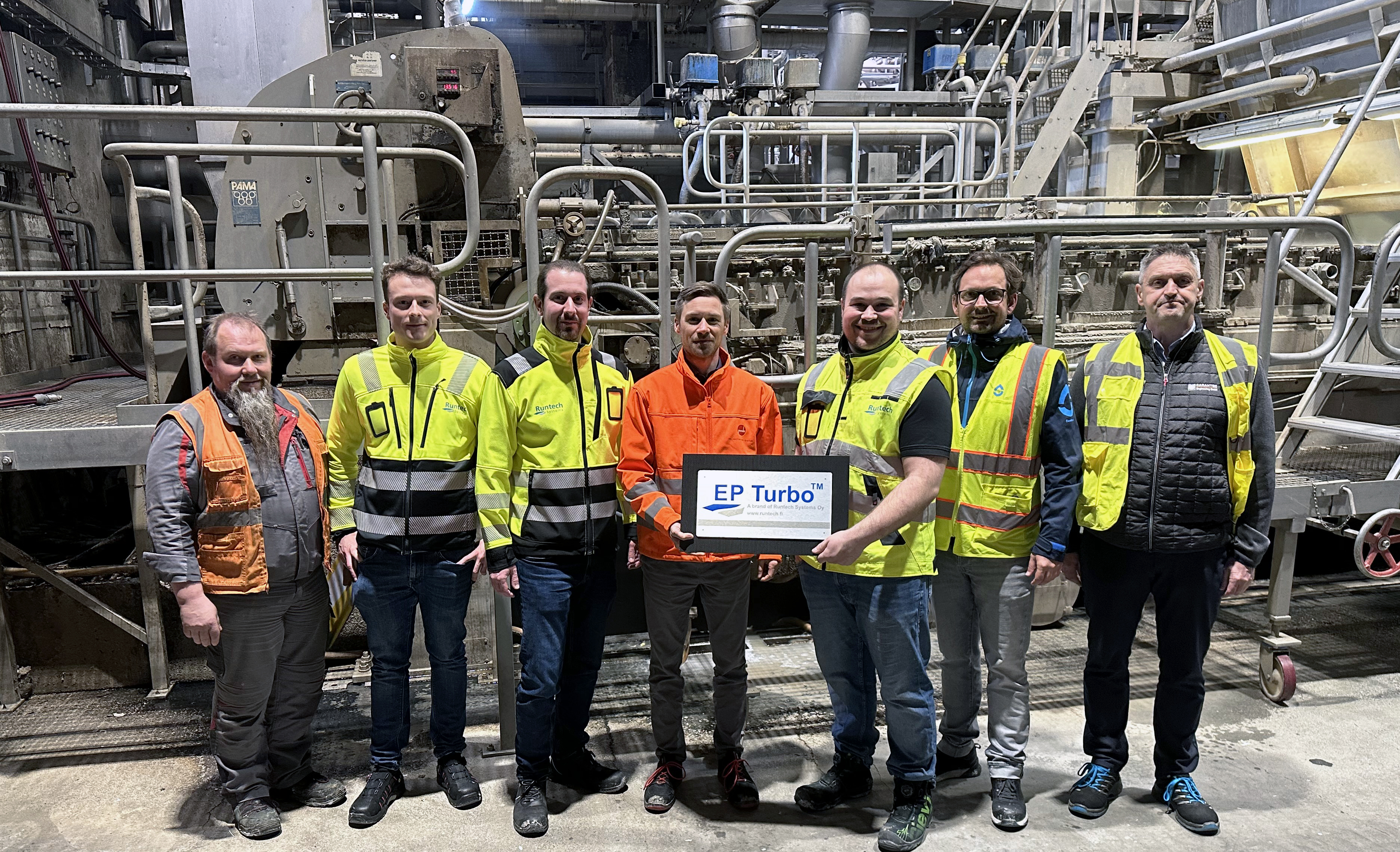 Benjamin Jentzsch from Rondo Ganahl received an EP Turbo-sign from Jelle Schuivens, Runtech Systems, to celebrate the project. The team was photographed during the kick-off meeting: (from the left) Martin Egger, Rondo Ganahl, Sören Siebrecht and Marcus Glaser from Runtech Systems, Andreas Schober, Flowtec Industrietechnik GmbH, and Helmut Kremsbrucker from Carantec Engineering GmbH. Photo: Runtech